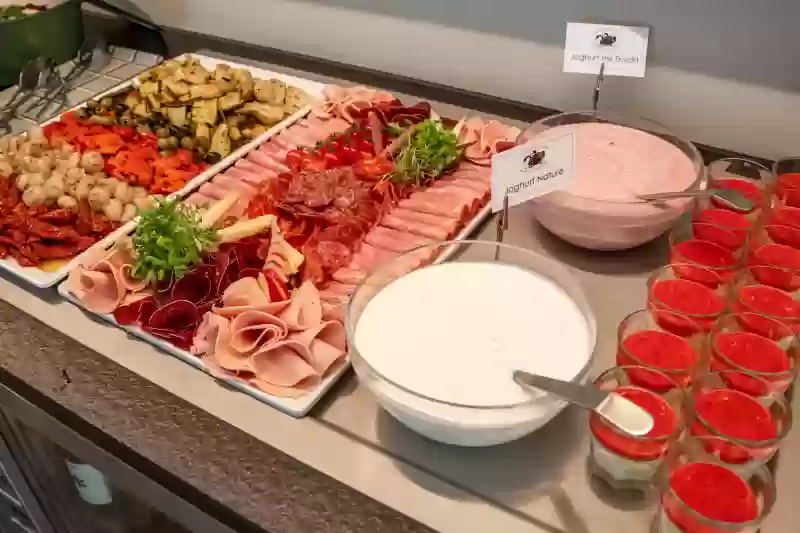 Schweizer Salami, Vorderschinken und Hinterschinken, eingelegtes Gemüse, Käseplatte mit weich-, halbhart- & Hartkäse, saisonale Früchteplatte, Griesschöpfli, Fruchtjoghurt, Naturjoghurt, Cornflakes & Müesli, Honig, verschiedene Konfitüren, Butter und Margarine